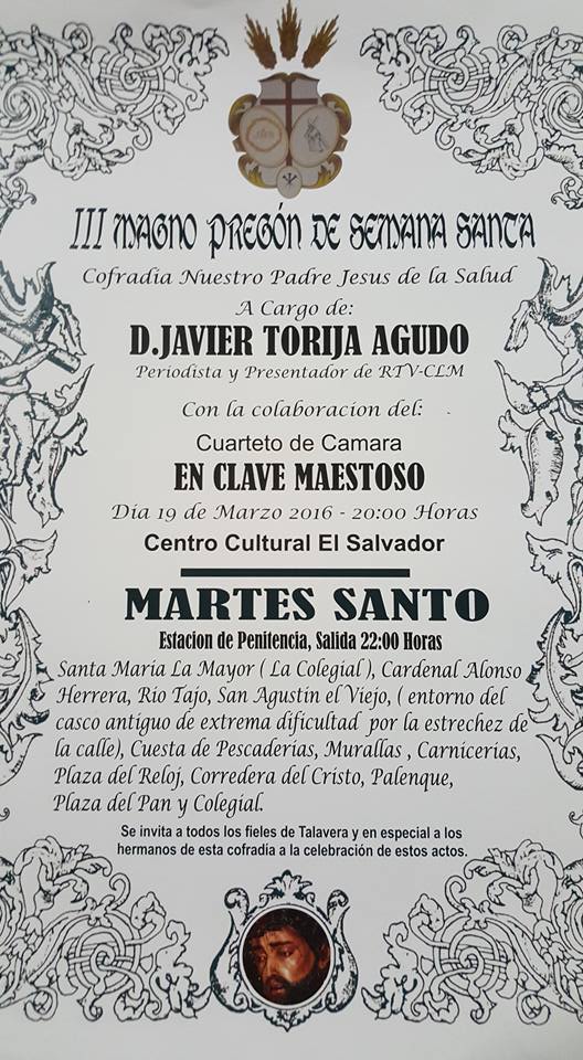 La Cofradia Nuestro Padre Jesús de la Salud realizará en honor de todas las asociaciones de enfermos , familiares y enfermos en especial su tradicional salida extraordinaria que se realizará el dia 17 de Julio de 2016 a las 10.30 de la mañana, con salida desde la Colegial. (Sede Canonica de la cofradía). Con un recorrido por el casco antiguo, se hace un llamamiento a los fieles de Talavera para que nos acompañen en un acto tan especial.